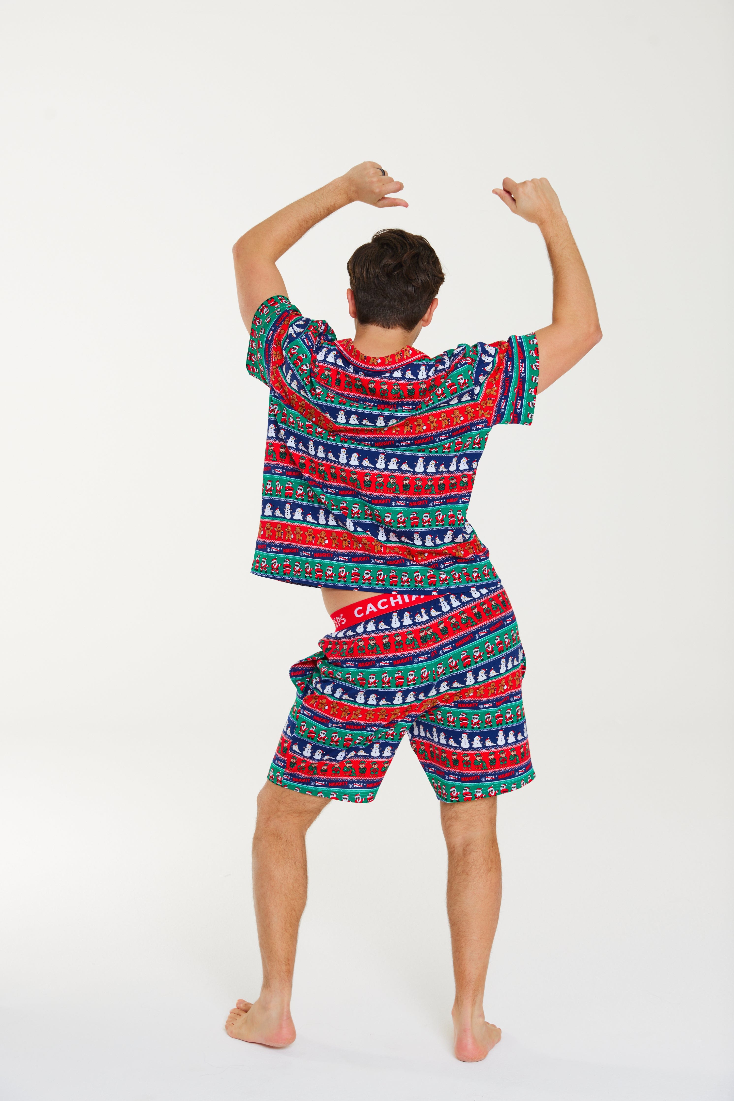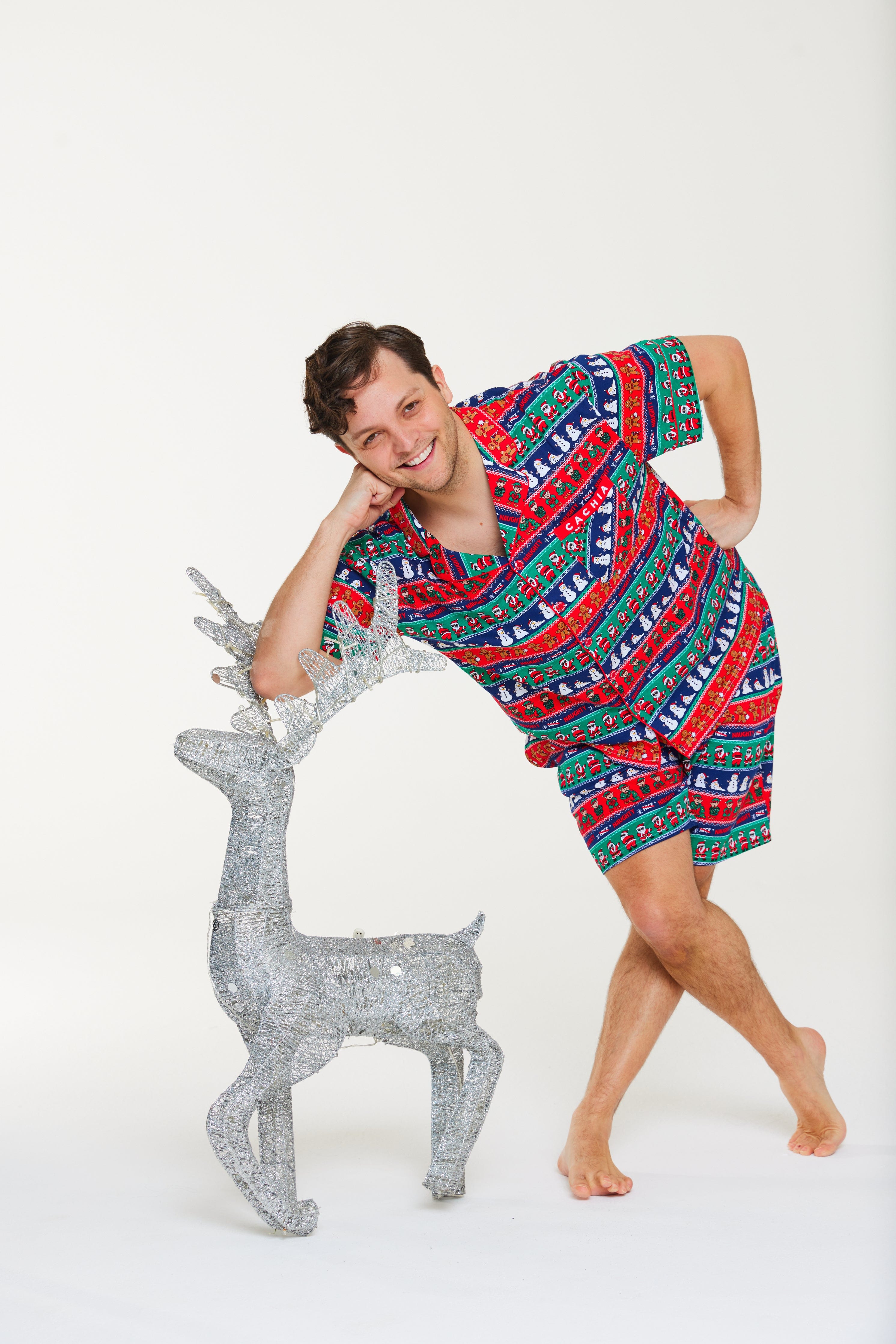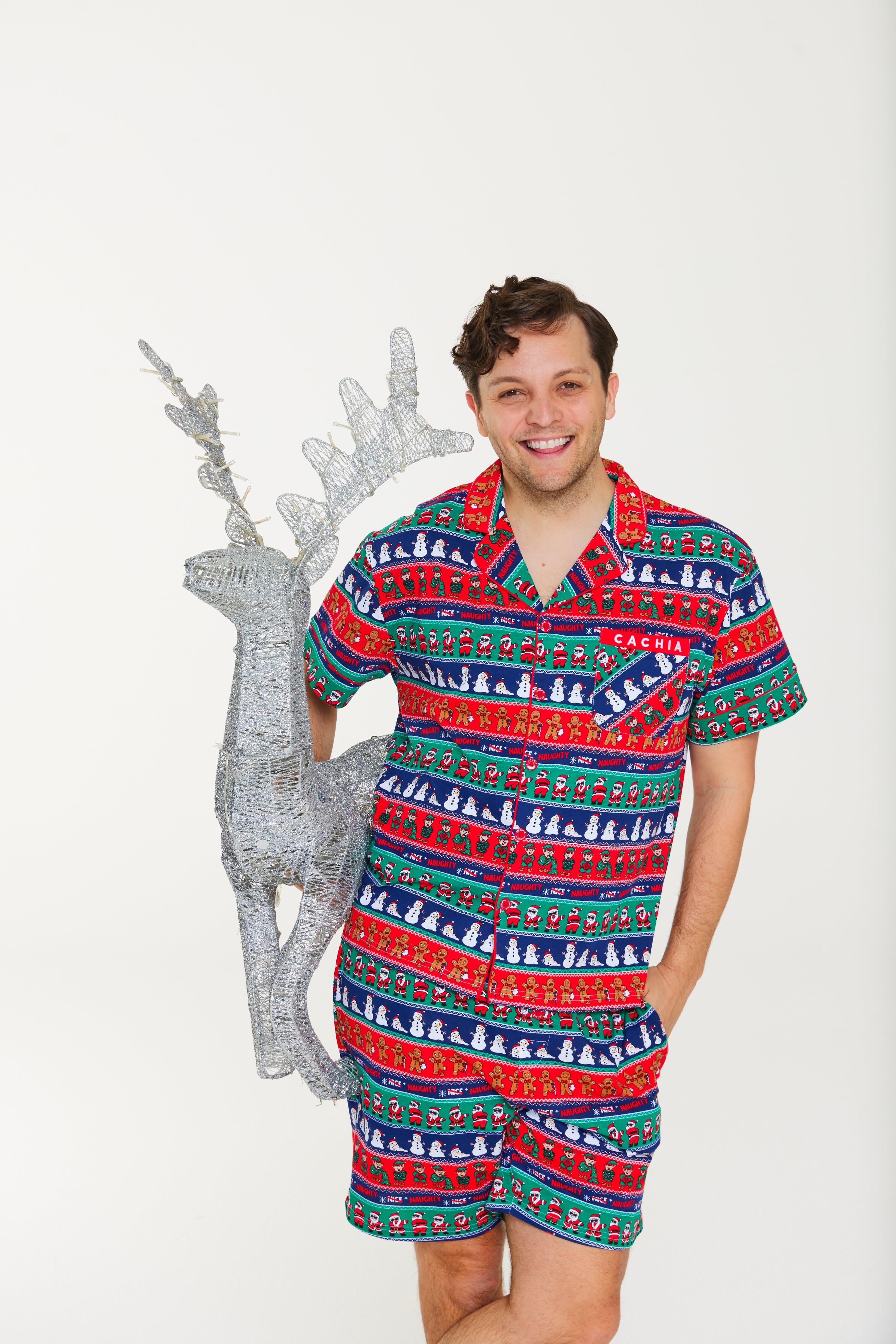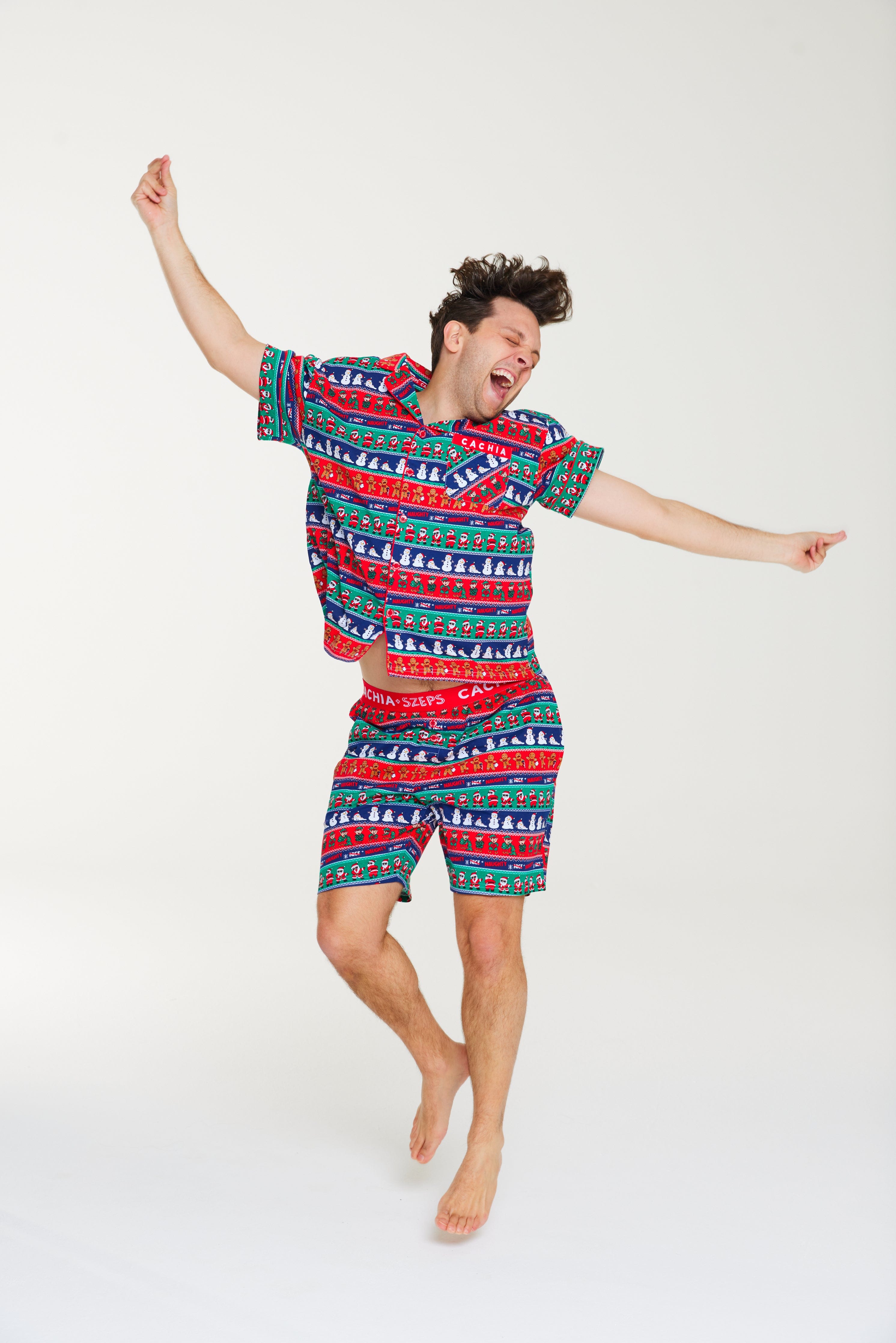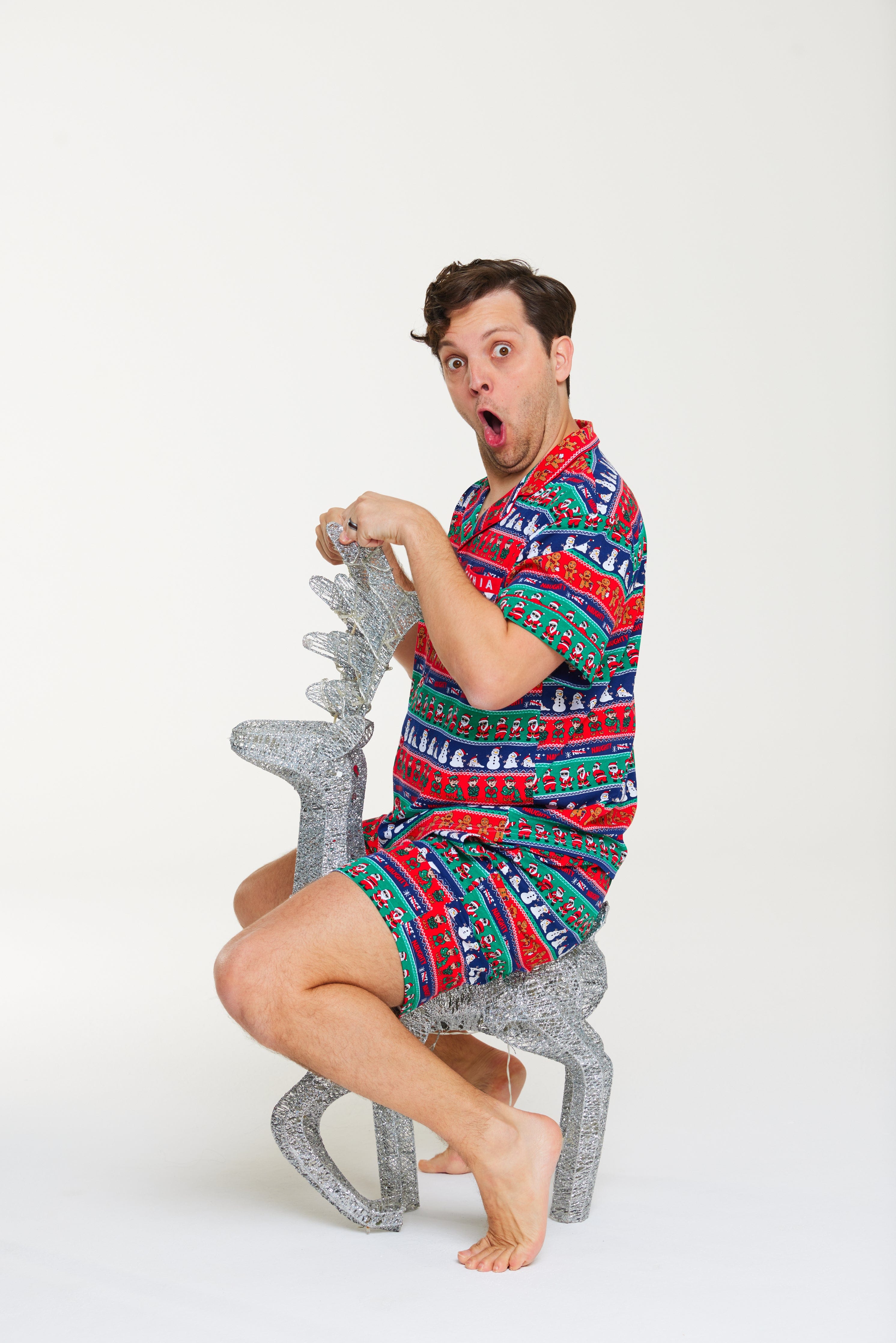 Get festive the cheeky way with the Ho Ho No men’s Pj Set, created in collaboration with Sean Szeps! Featuring a playful twist on the classic fair isle print, it showcases naughty gingerbread men, twerking Santas, melting snowmen, and mischievous elves. Made from our breathable cotton jersey in a relaxed button-up style with matching shorts, this set is built for laughs, lounging, and unforgettable Christmas moments!