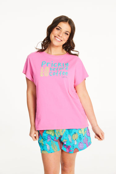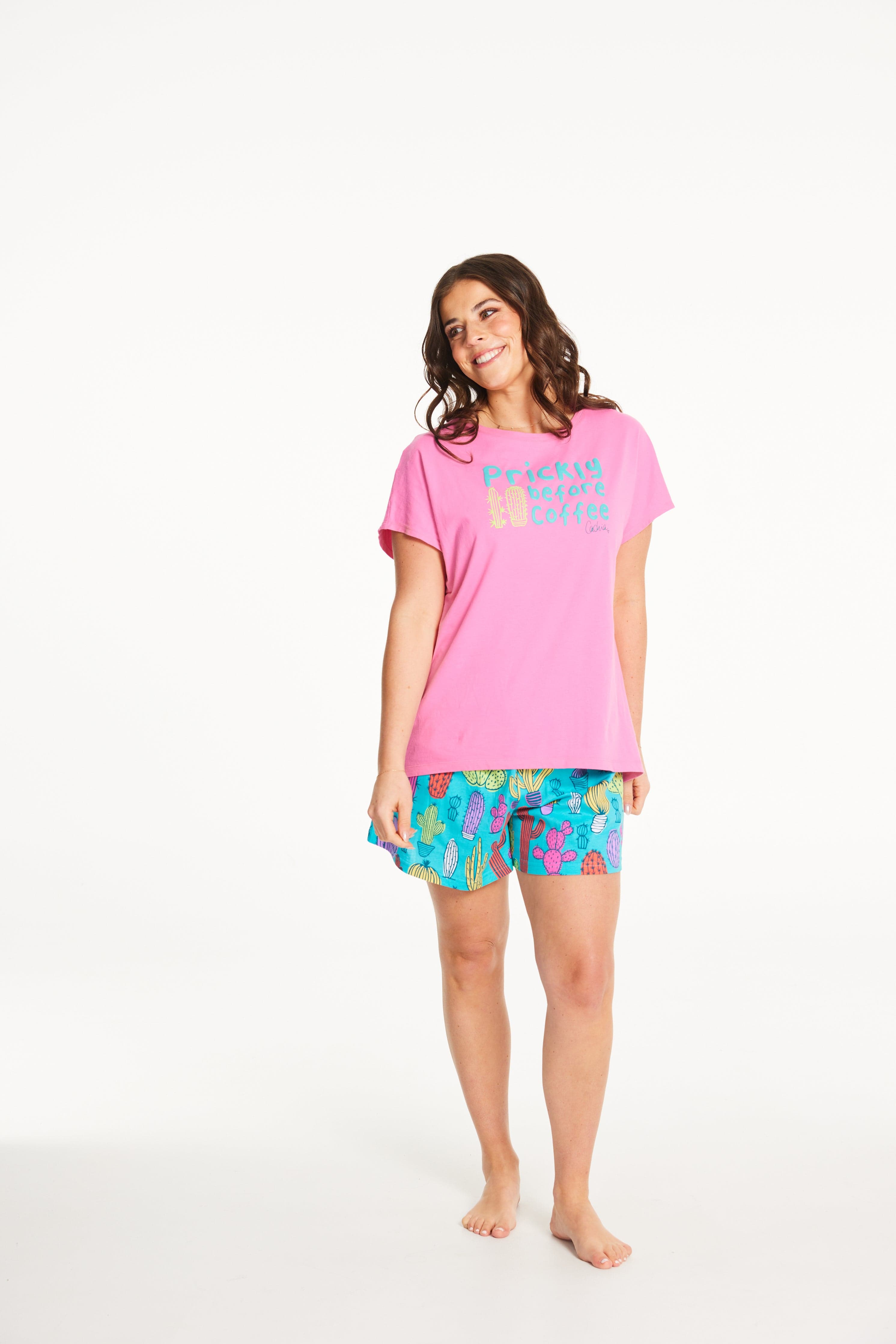 Start your mornings with a giggle in the Prickly Shorty set! The pink cotton top features a fun “prickly before coffee” puff print that speaks for itself. Paired with vibrant cactus-print shorts on a aqua/teal base, this set brings the personality to your pyjama drawer!