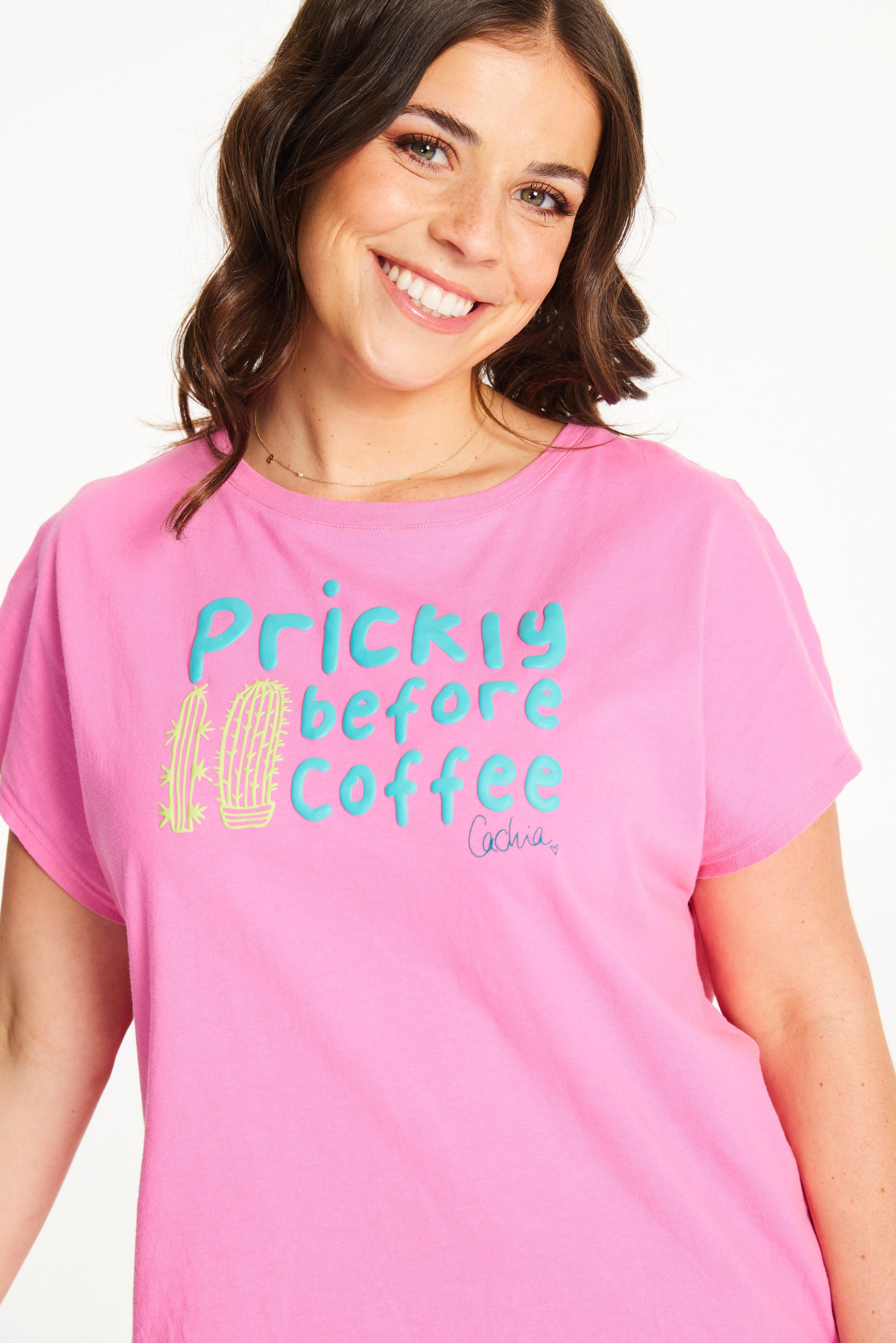 • Custom 'Prickly Before Coffee' puff print on t-shirt