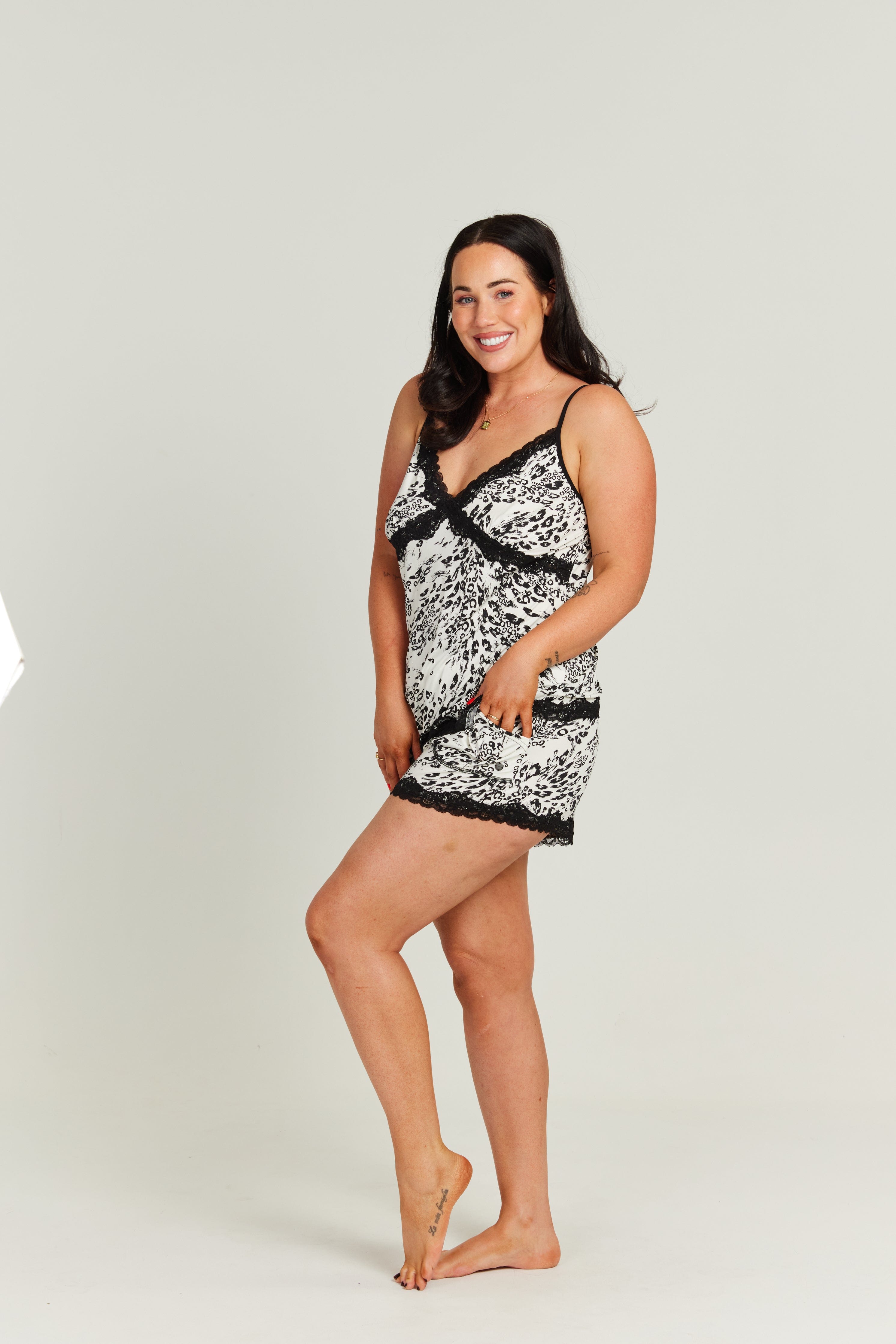 Say hello to the Wild Whisper Cami & Short set, the sleepwear duo you’ll be reaching for on repeat! Designed in a dreamy cream and black leopard print, this set is made from our new poly/elastane knit jersey that feels smooth, soft, and effortlessly flattering. The cami features delicate black lace at the bust, while the matching shorts include an elastic waistband and lace-detailed hems for comfort that moves with you.