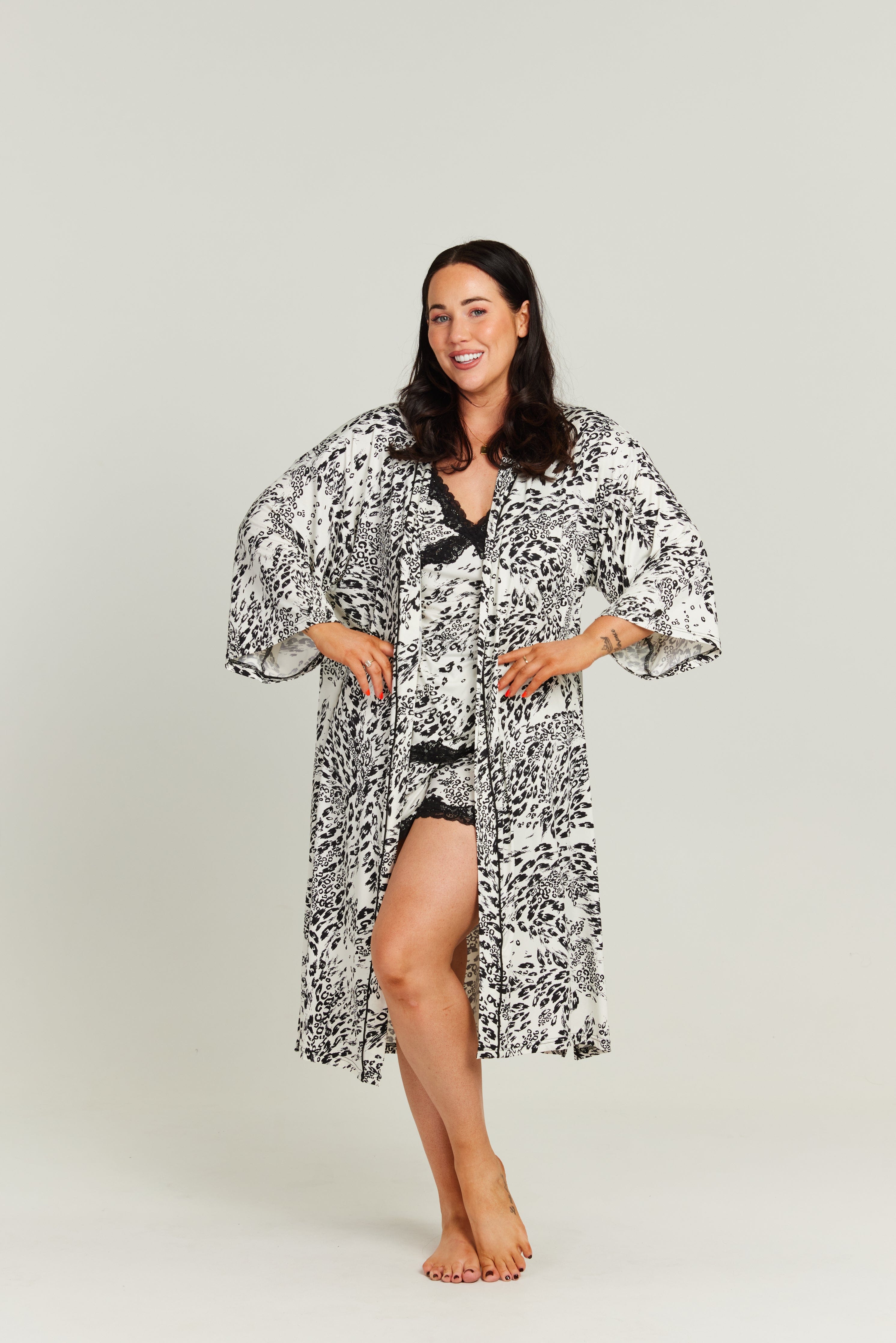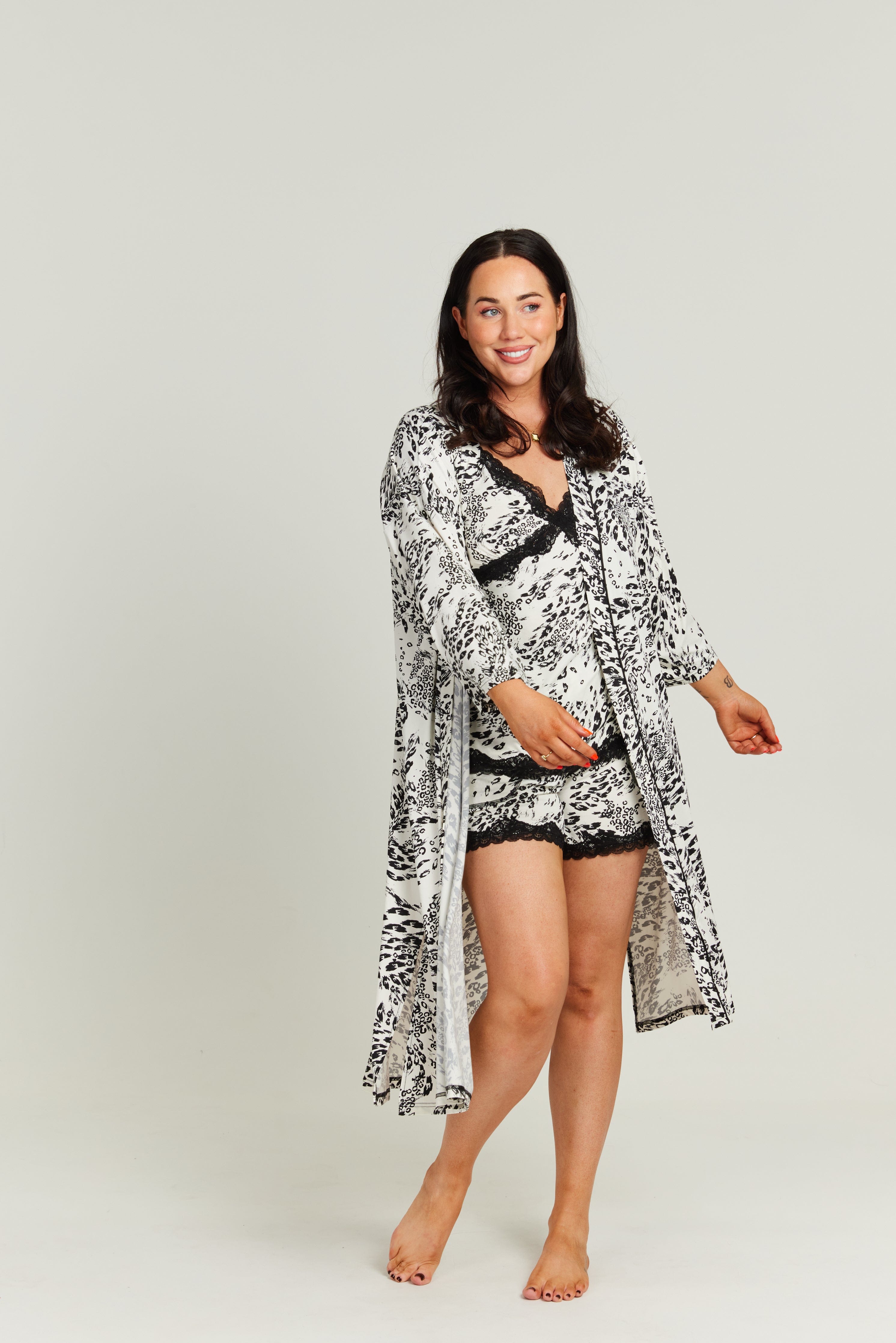 The Wild Whisper Kaftan is your new go-to for effortless elegance. Featuring a stunning black leopard print layered over a cream base for a sleek, elevated look. Designed with a folded self-fabric band and contrast piping, it brings a touch of refinement to your wind-down routine. The relaxed silhouette features wide 7/8 sleeves and subtle side splits, giving you room to move while draping beautifully on the body.